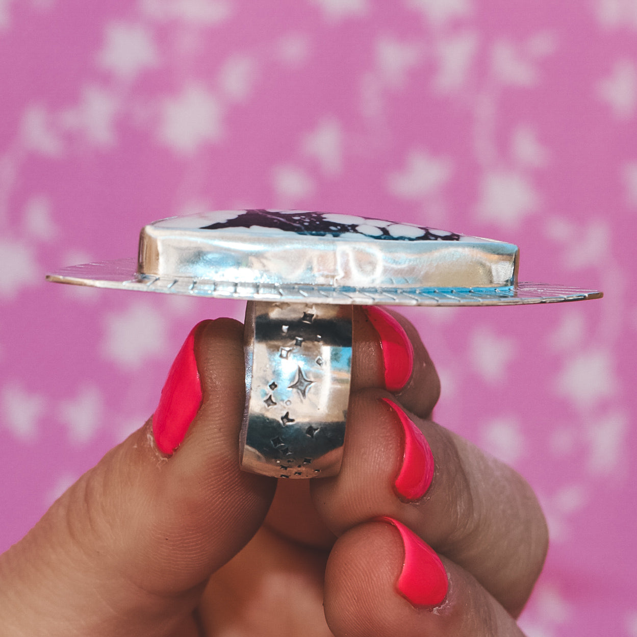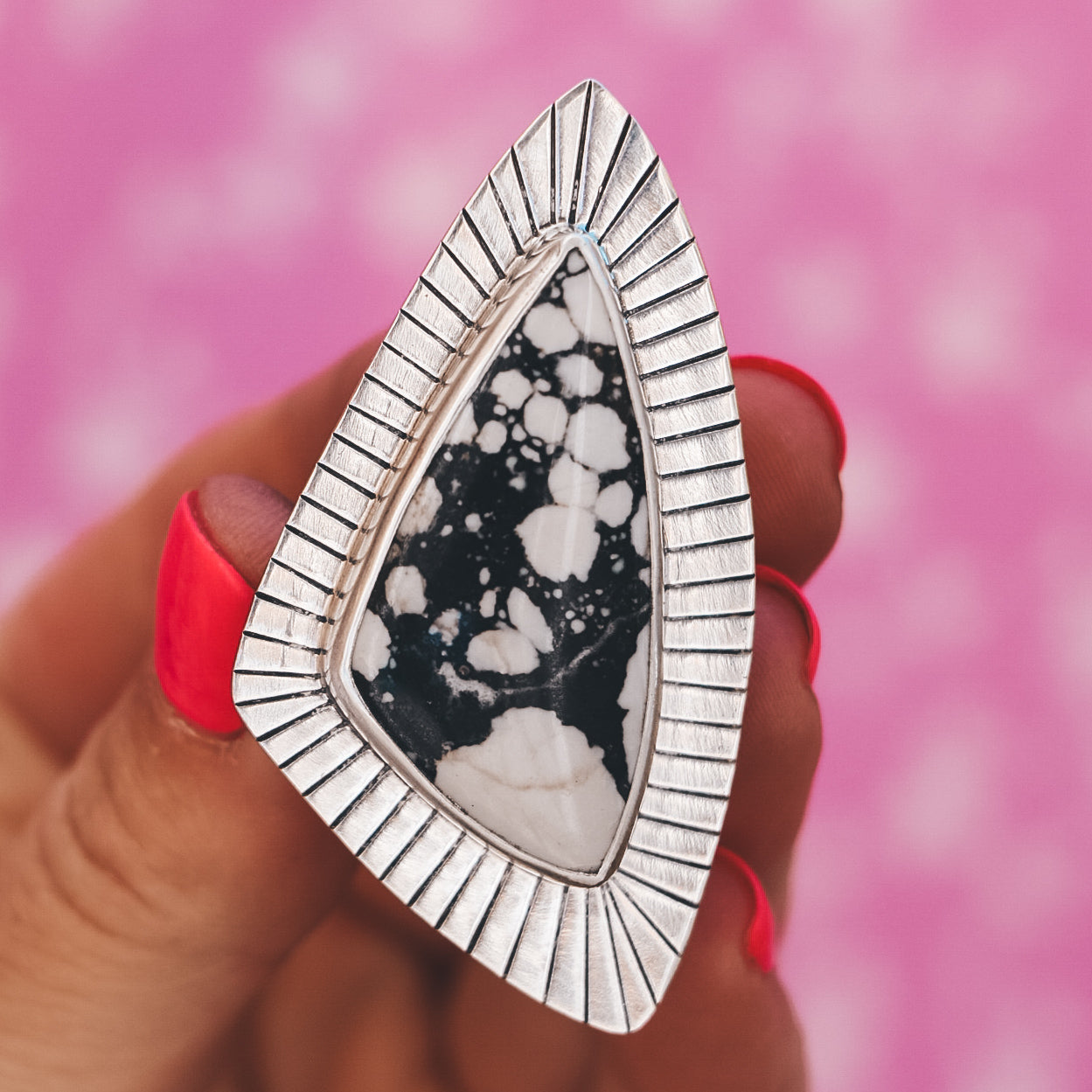 This ring features a stunning White Magnesite surrounded by my signature Sunbeam rays, mounted on a wide celestial patterned band.