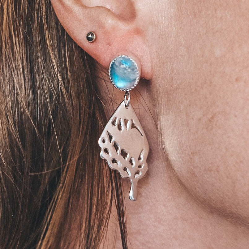 The Swallowtail Studs are a brand new design for Mineral + Mine, and are based off of a study of Swallowtail Butterfly wings. Each wing component is intricately carved and sawn by hand, and attached to a gemstone stud.