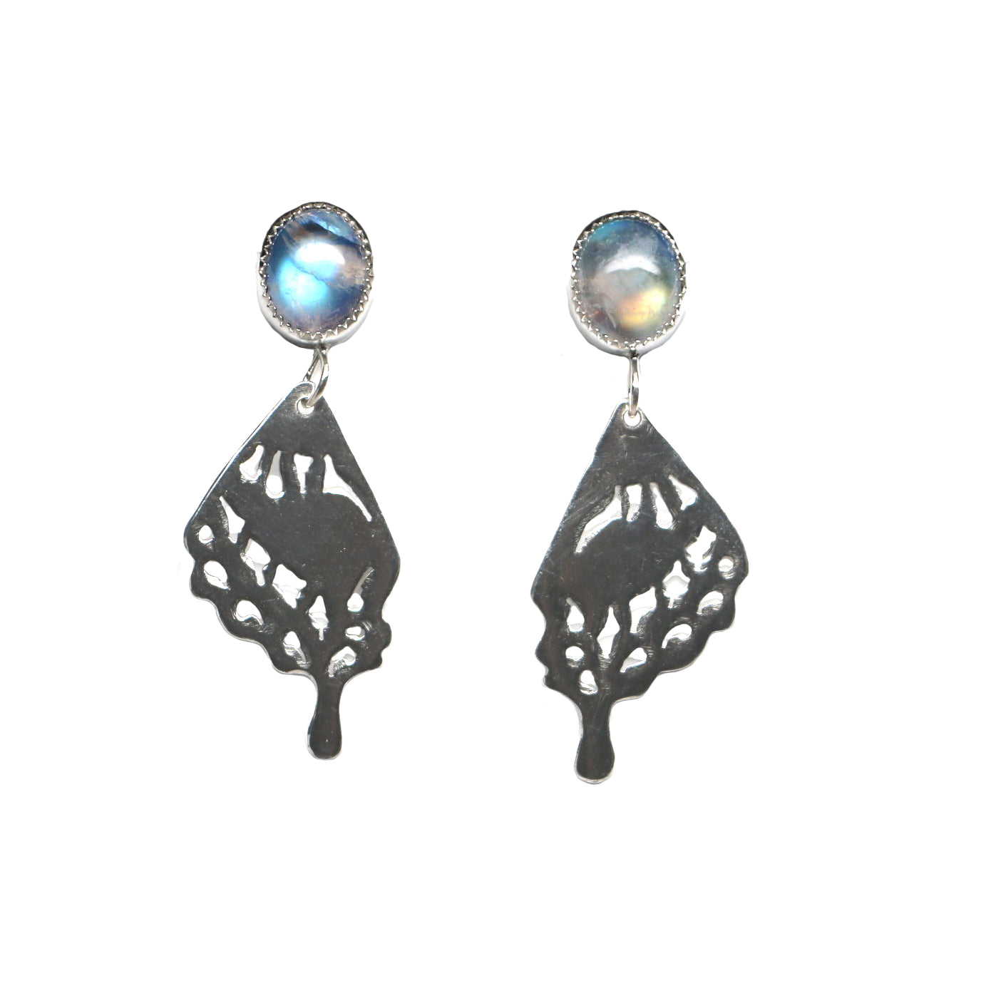 This pair of Swallowtail Studs features rainbow moonstone, which is milky white with iridescent rainbow flashes of blue and purple.
