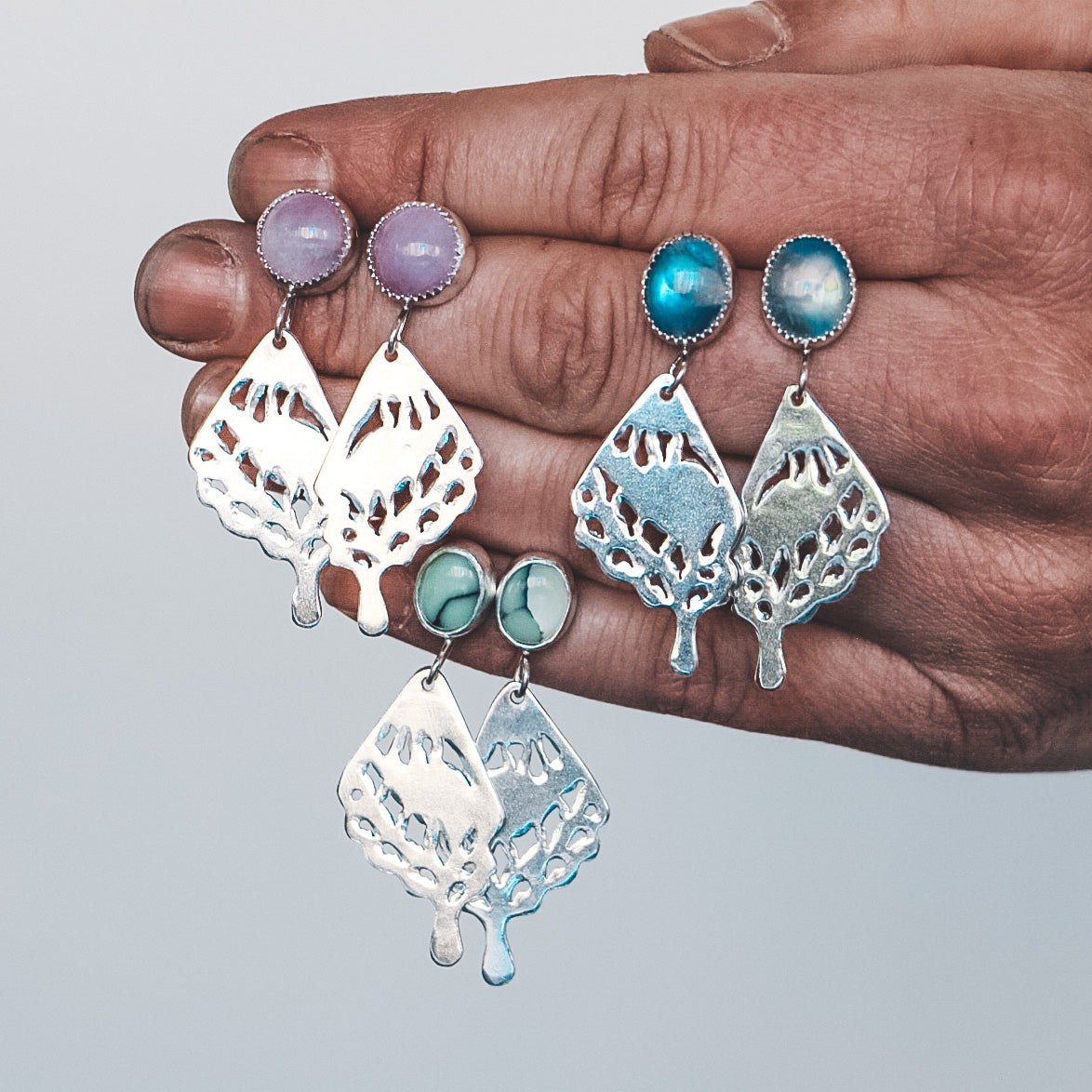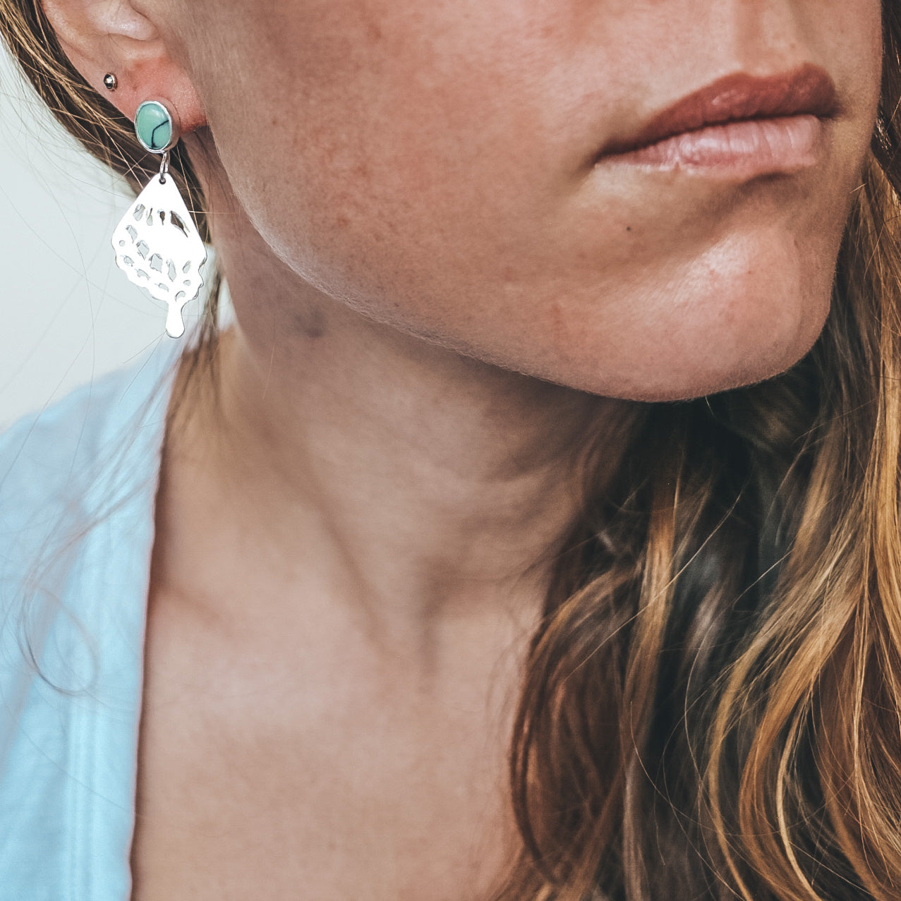 The Swallowtail Studs are a brand new design for Mineral + Mine, and are based off of a study of Swallowtail Butterfly wings. Each wing component is intricately carved and sawn by hand, and attached to a gemstone stud.