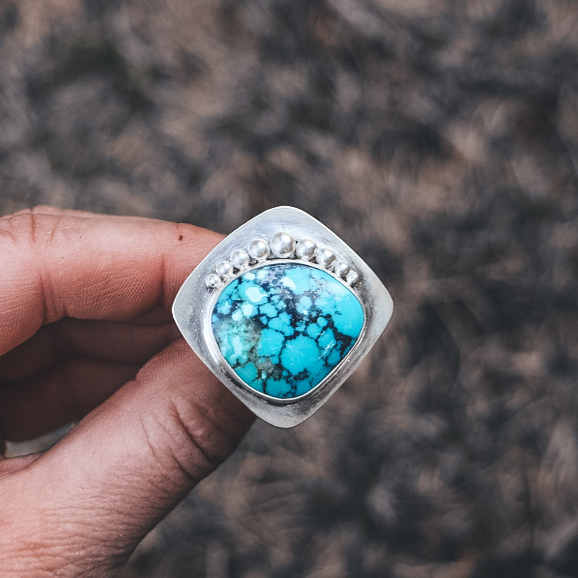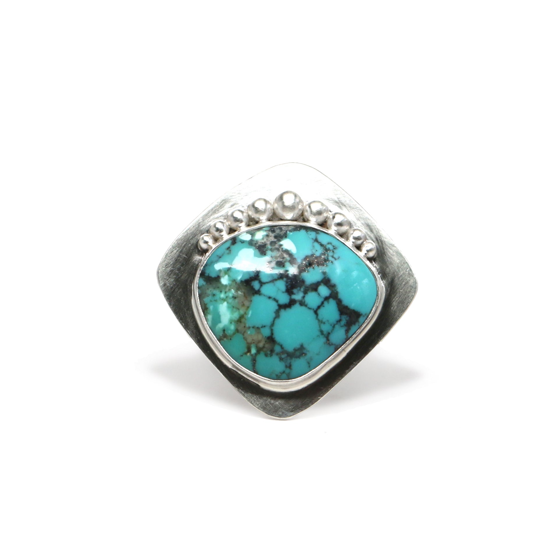 This statement turquoise stunner features Tibetan Turquoise with natural variations and ribbons of color.