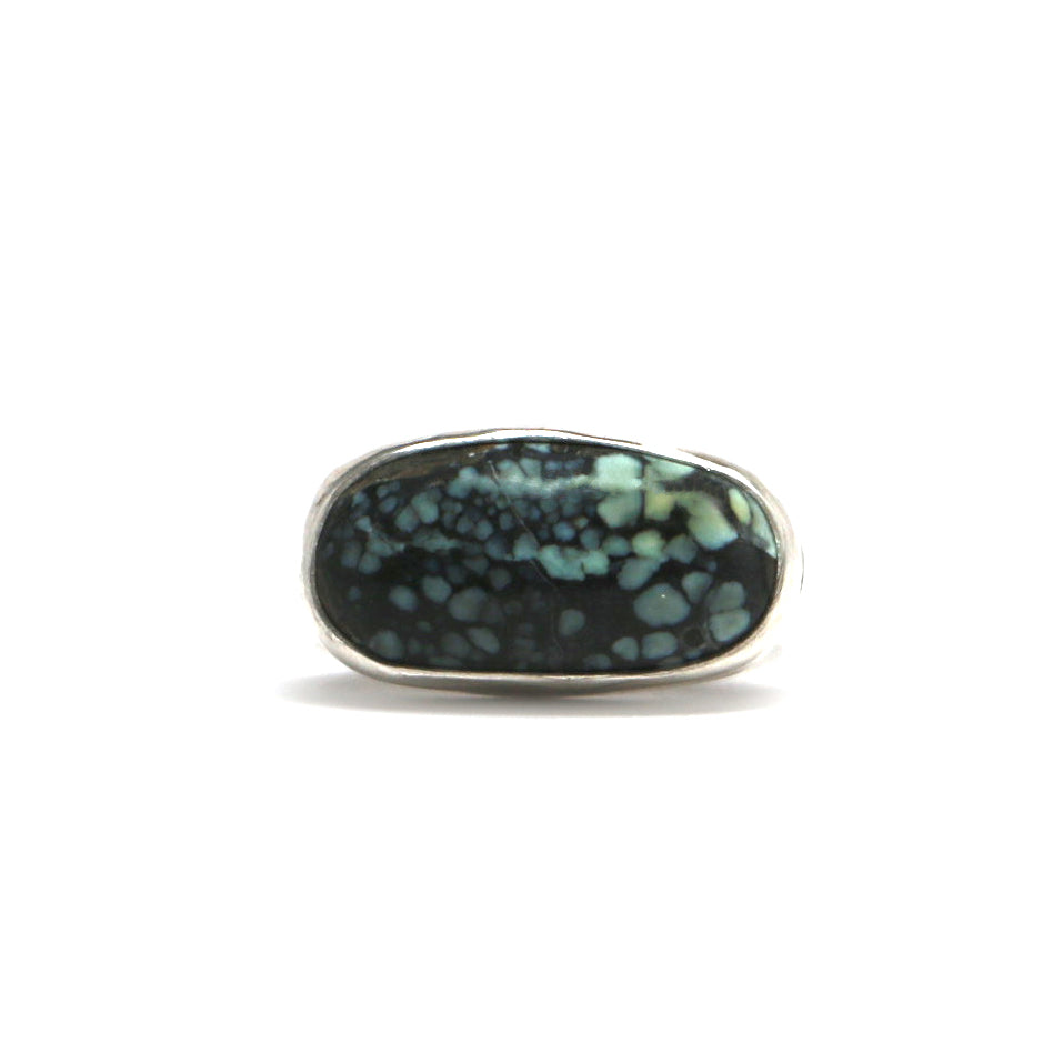 This horizontal Latitude ring features a Tree Frog Variscite stone in deep grey with flecks of teal-green to yellow-green. In the 4th image, this ring is on the far left.