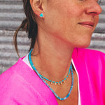 These studs are crafted from sterling silver and fine silver and feature Hubei turquoise stones and brass dot accents.
