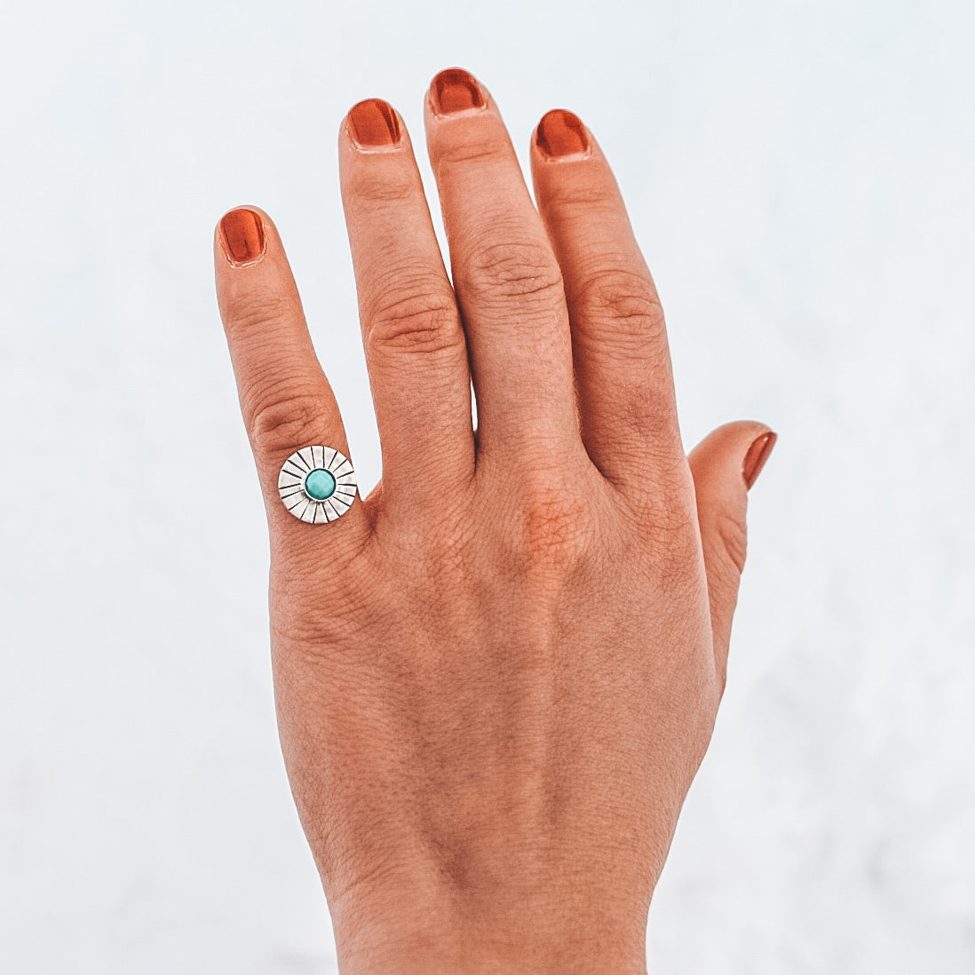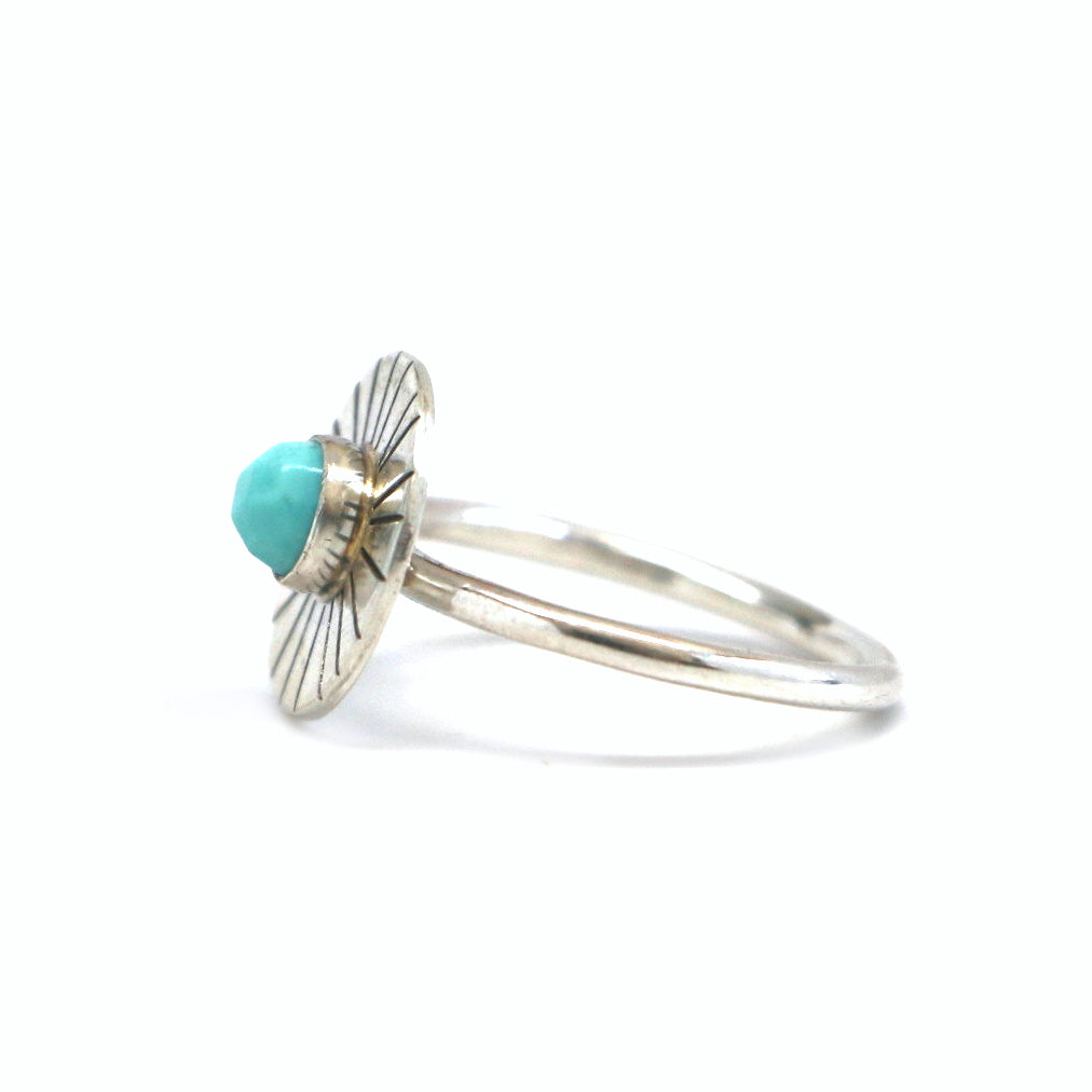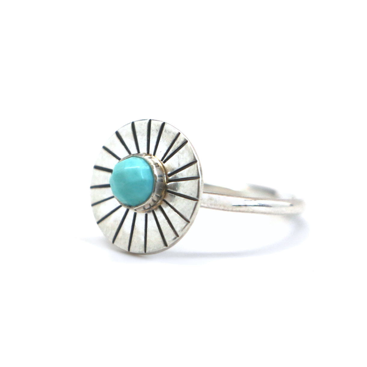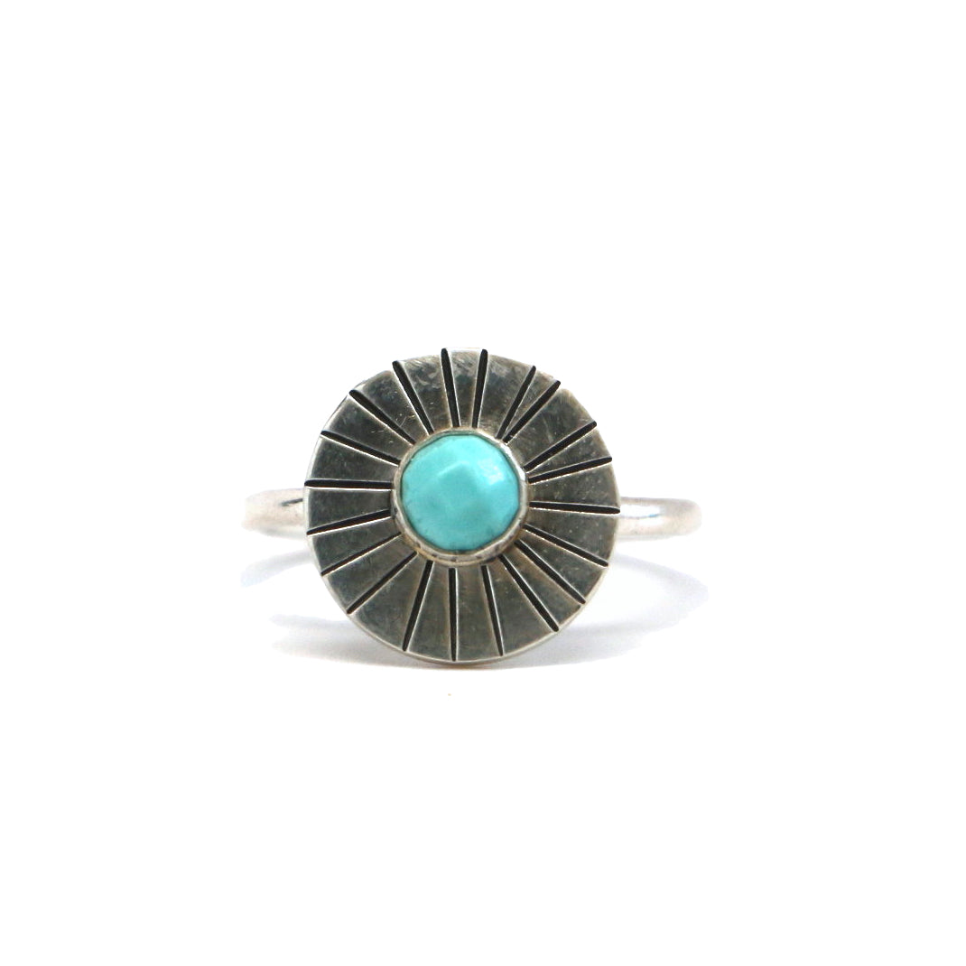 This dainty ring features a faceted sleeping beauty turquoise stone set in sterling silver, with a hand-stamped burst pattern. Since the stamping is done by hand, the lines may vary slightly with each individual ring.