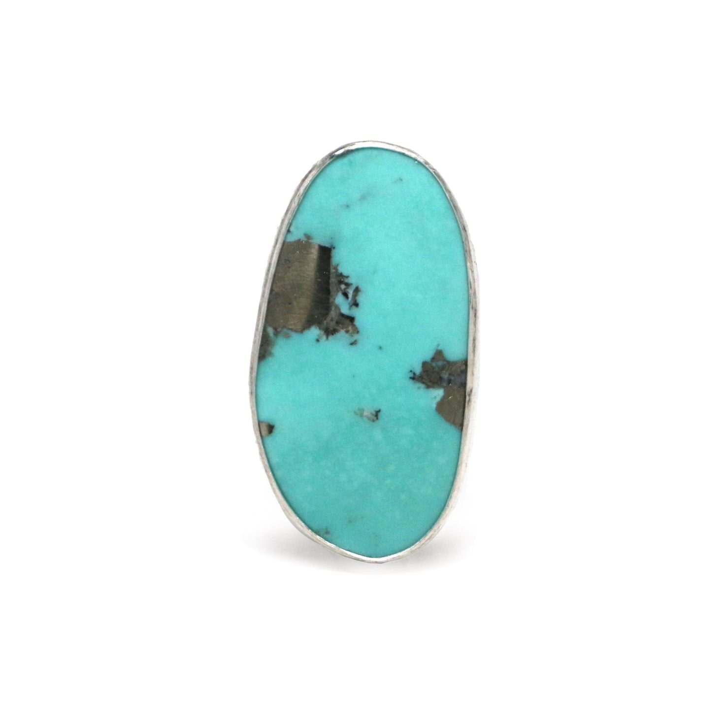 This showstopping, oversized statement ring features a Campitos Turquoise stone in stunningly bright teal with large swaths of pyrite inclusions.