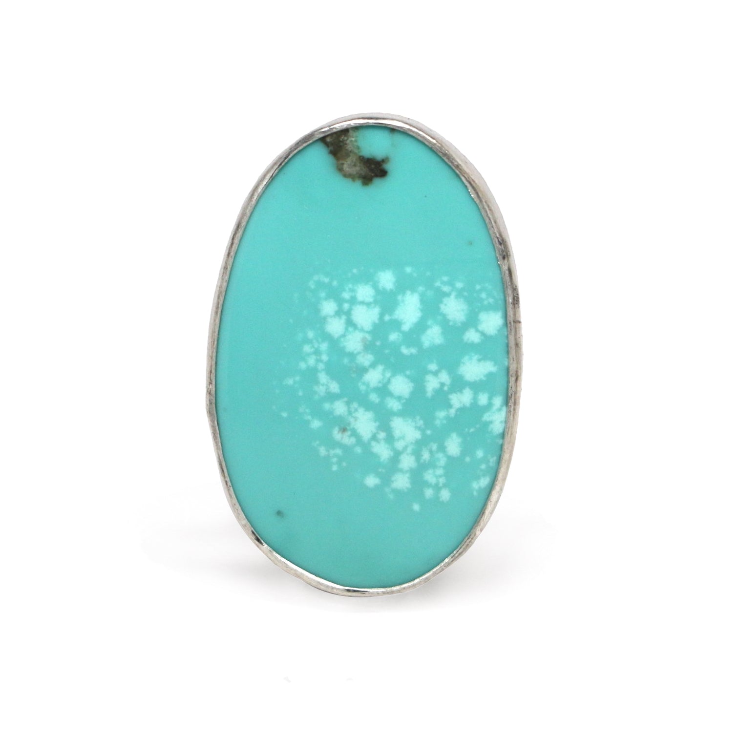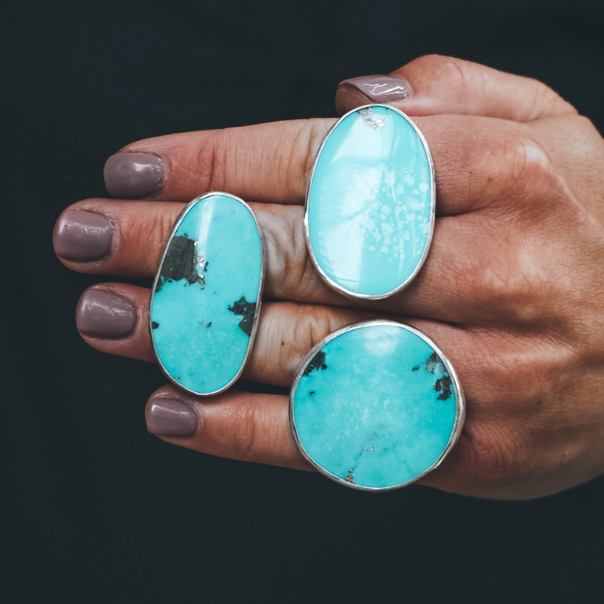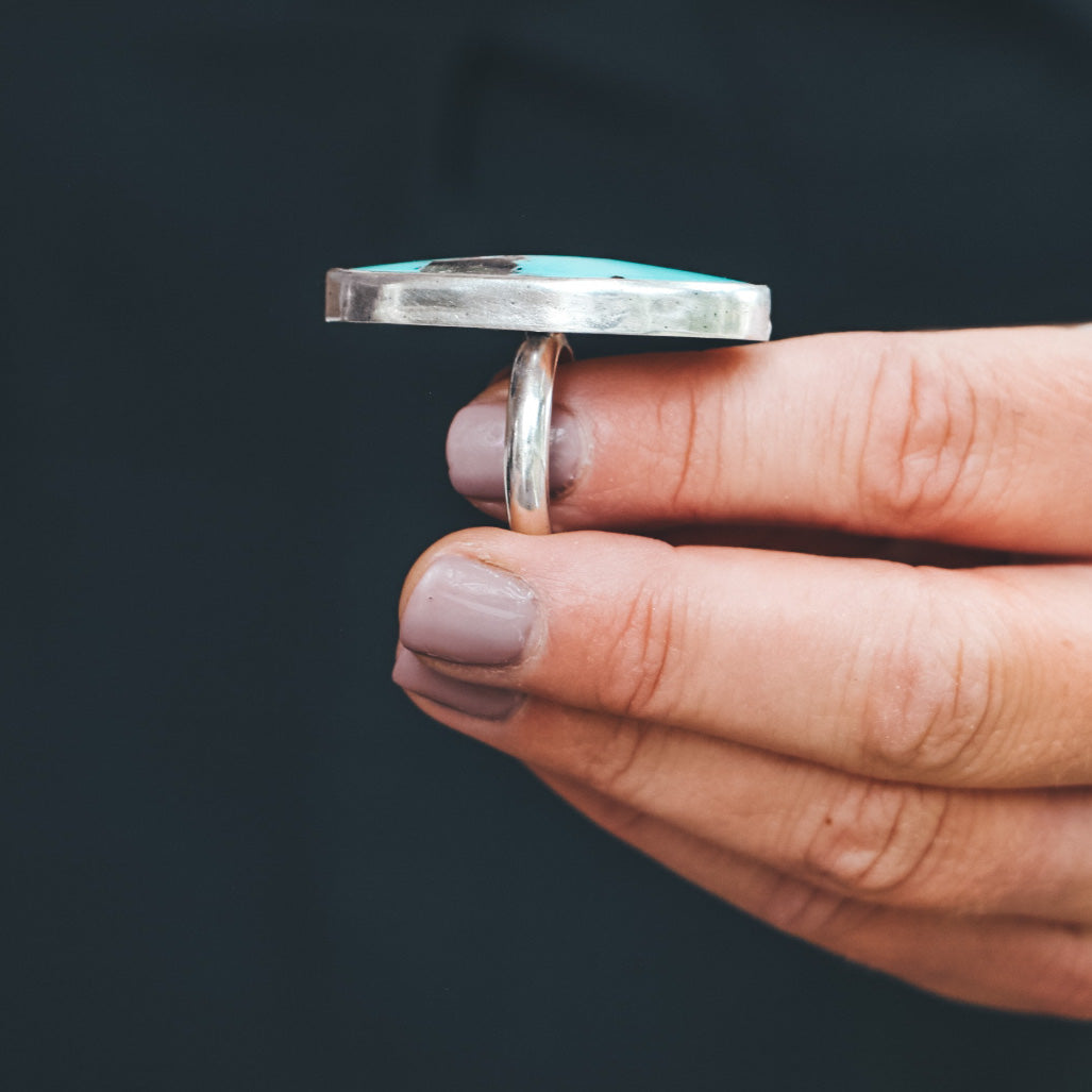 This showstopping, oversized statement ring features a Campitos Turquoise stone in stunningly bright teal with pyrite inclusions and some pale turquoise mottling.