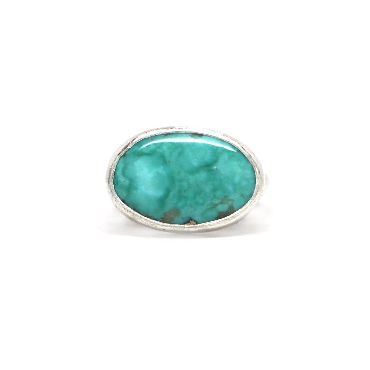 This horizontal Latitude ring features Kingman Turquoise, which is bright teal in color with some pale grey pyrite inclusions and natural veining.