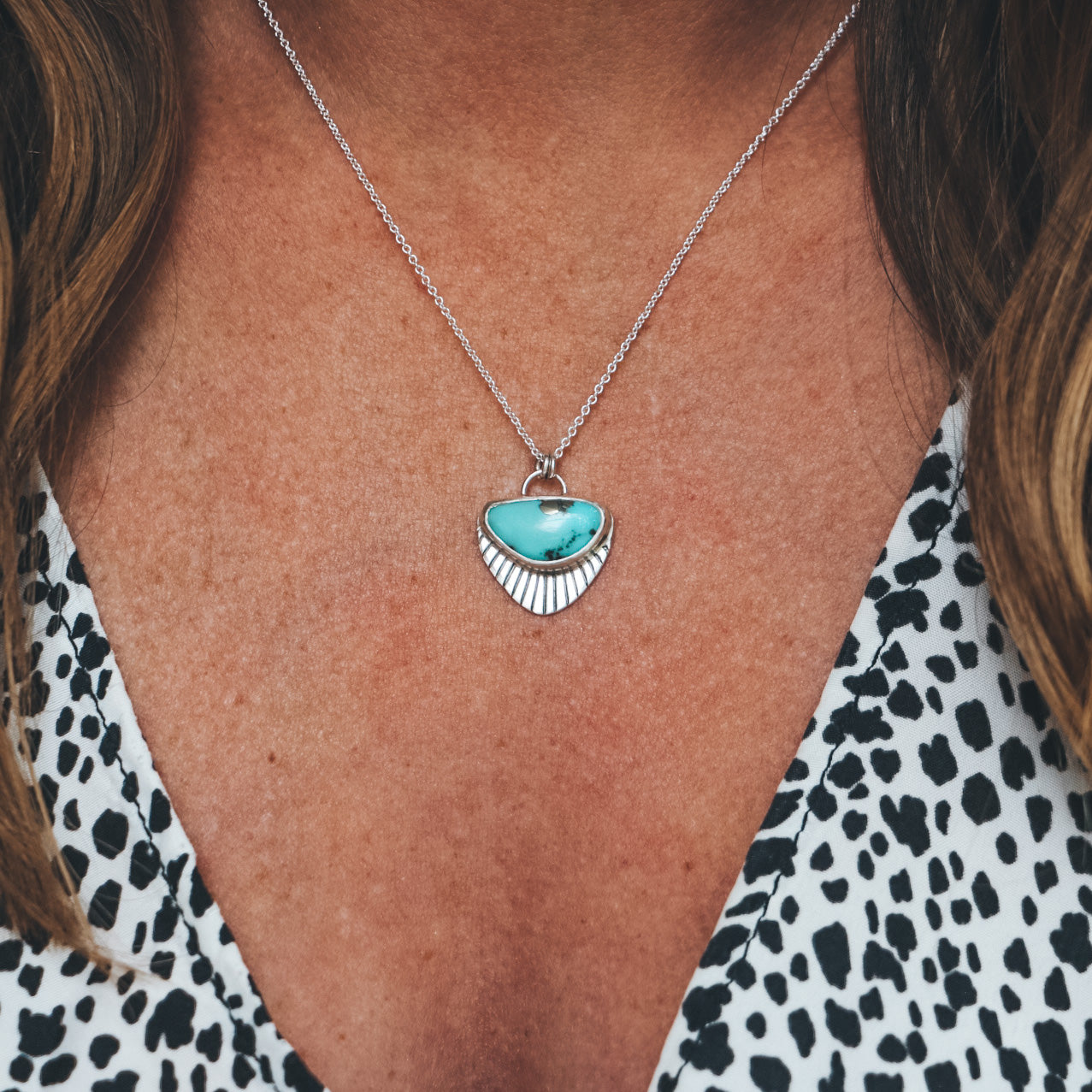 This necklace features Campitos Turquoise, mined in Mexico. The stone is brilliant teal with natural flecks of silvery pyrite inclusions, and is set in sterling silver and fine silver. The pendant measures 22mm tall by 18mm wide.