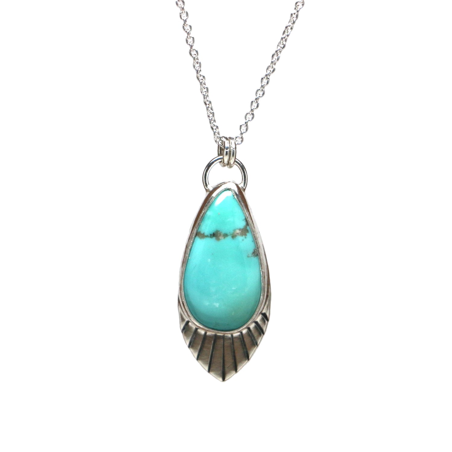 This necklace features Campitos Turquoise, mined in Mexico. The stone is bright teal with little ribbon of pyrite, and is set in sterling silver and fine silver. The pendant measures 32mm tall by 12mm wide.