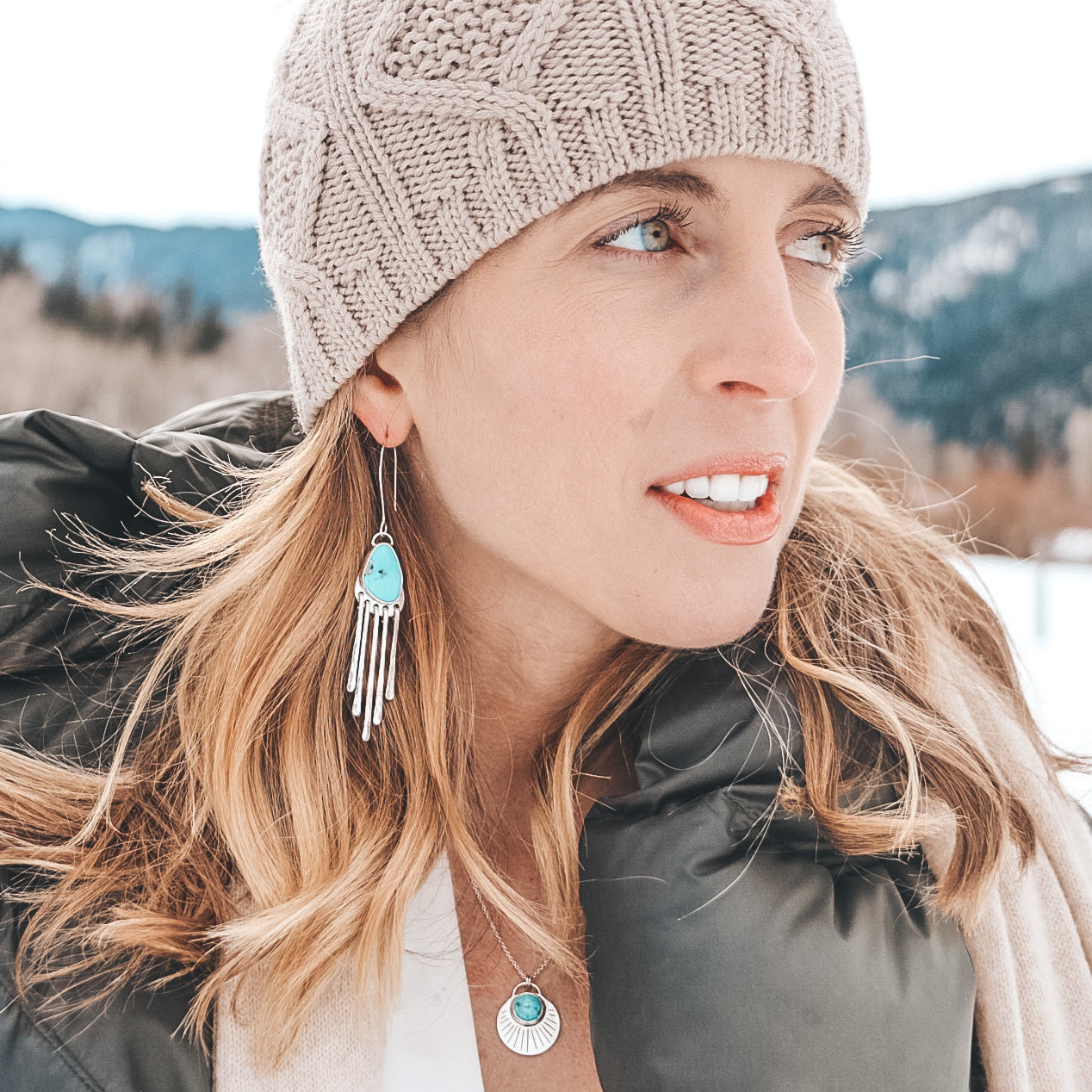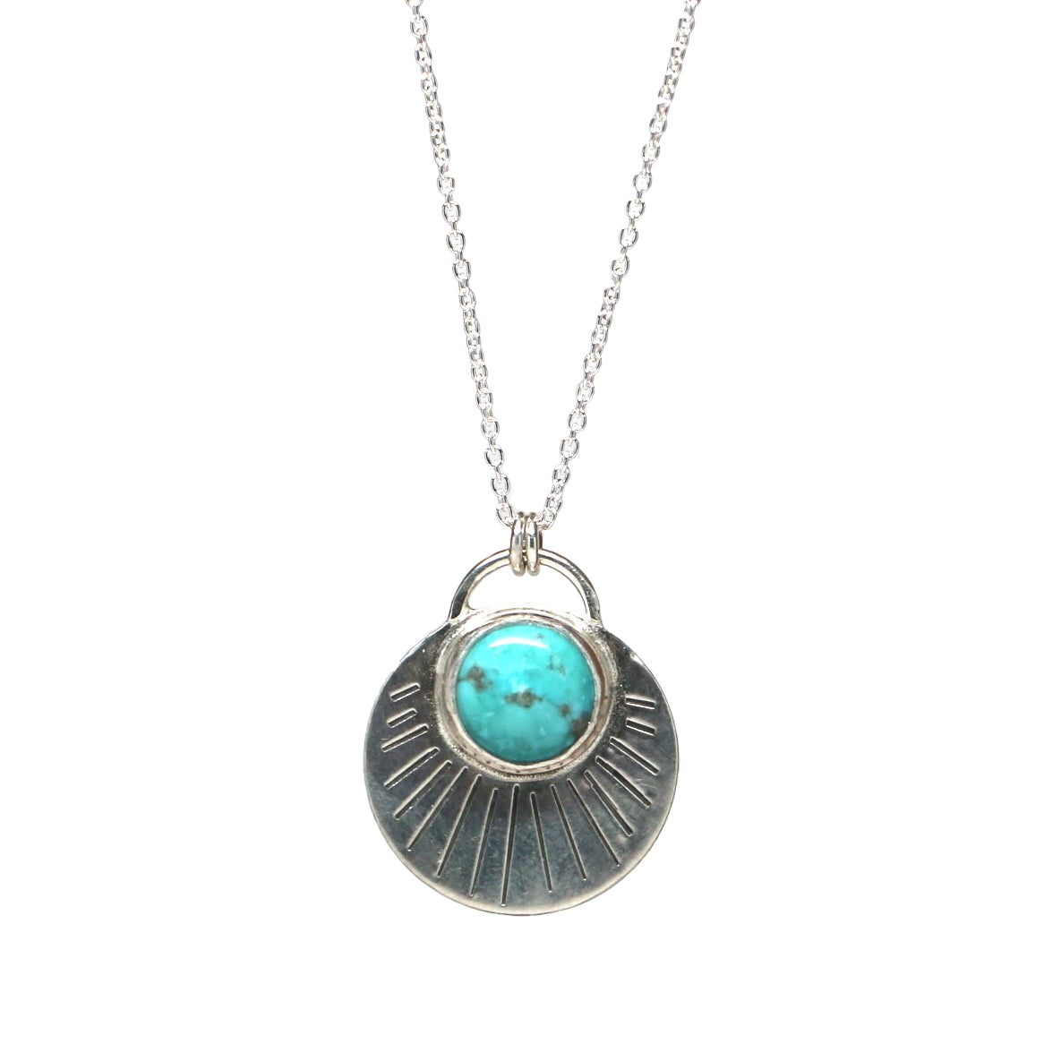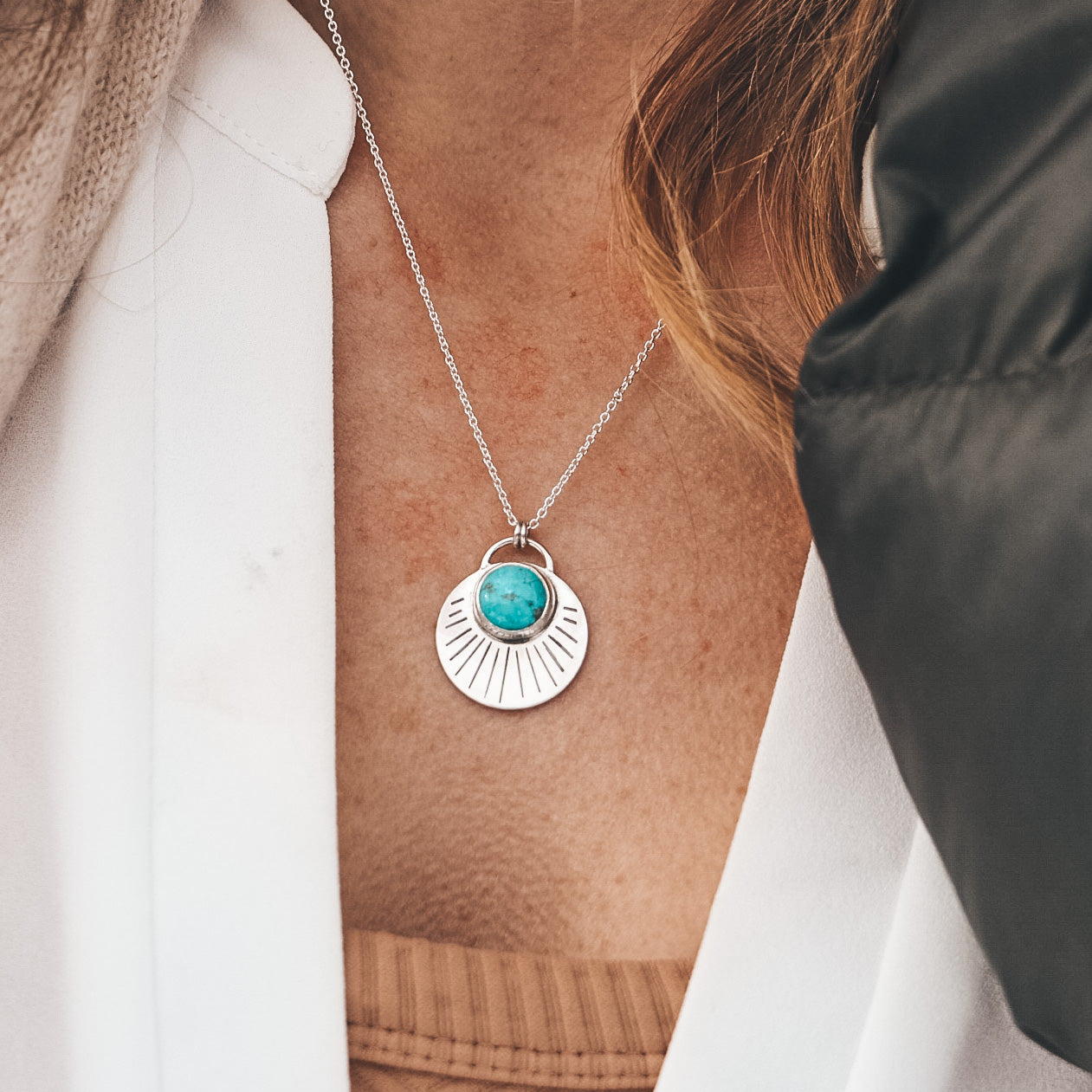 The Turquoise Rising Necklace features clean lines in a sunrise pattern - a signature style of Mineral + Mine. The stone in this piece is Campitos turquoise, which is mined in Sonora, Mexico, and is light teal in color with natural pyrite inclusions.