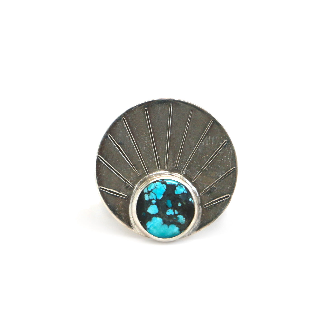 This turquoise 'sunrise' ring features Hubei Turquoise with natural black rutilations.