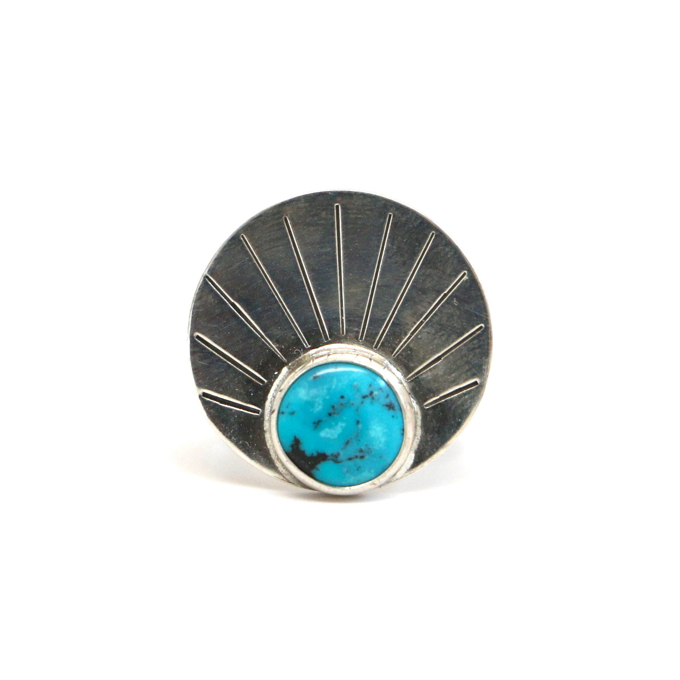 This turquoise 'sunrise' ring features Hubei Turquoise with natural black rutilations.