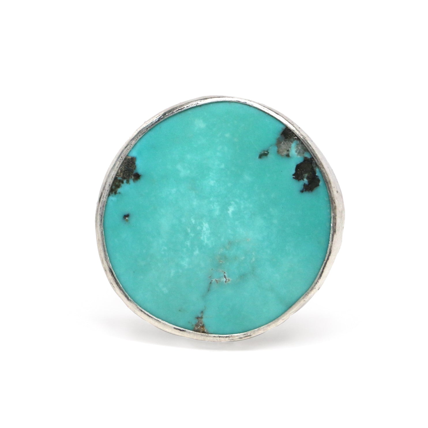 This showstopping, oversized statement ring features a Campitos Turquoise stone in stunningly bright teal with pyrite inclusions.
