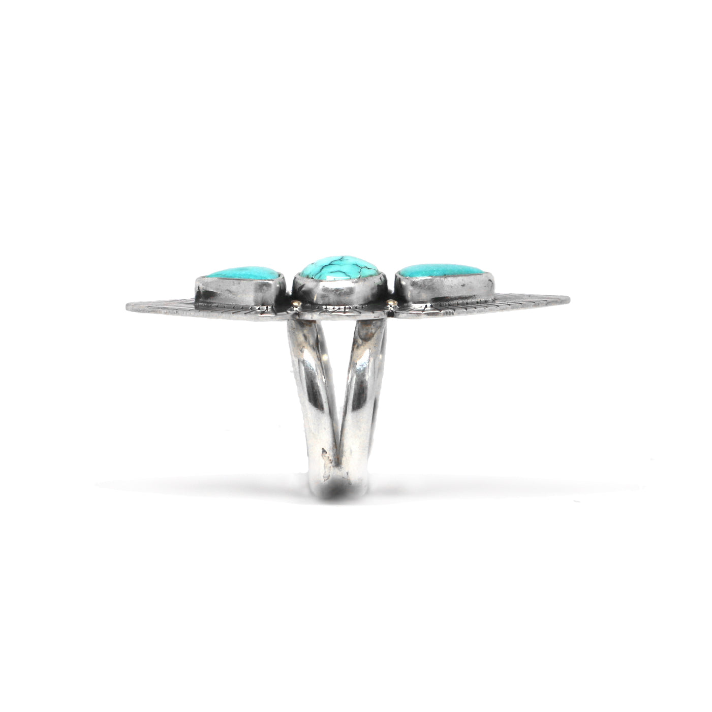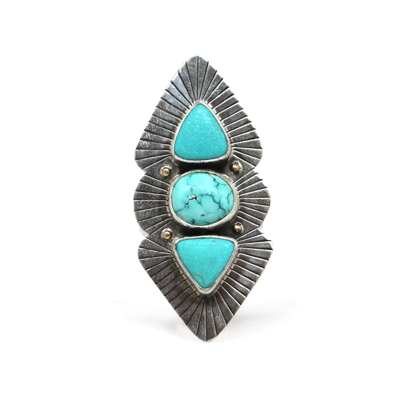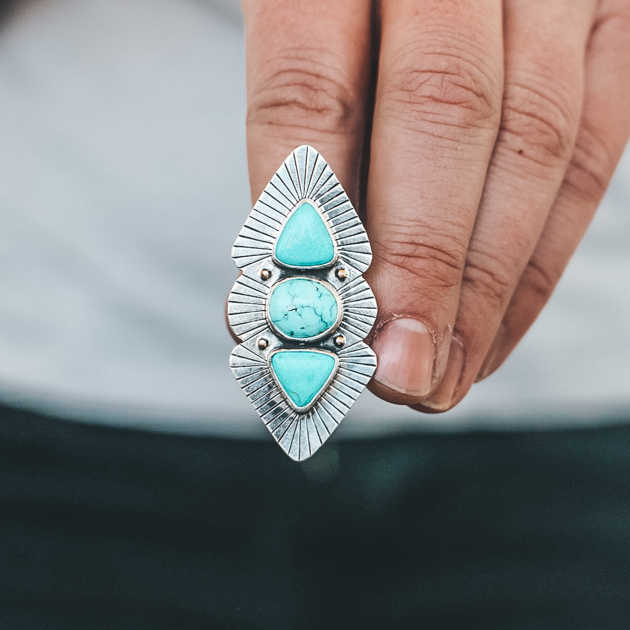 This triple stone ring features three complementary Mexican Turquoise stones (the triangles at the ends) and a Blue Moon Turquoise stone (middle). The stones are set in fine silver with a hand-stamped sterling silver backplate and brass details.