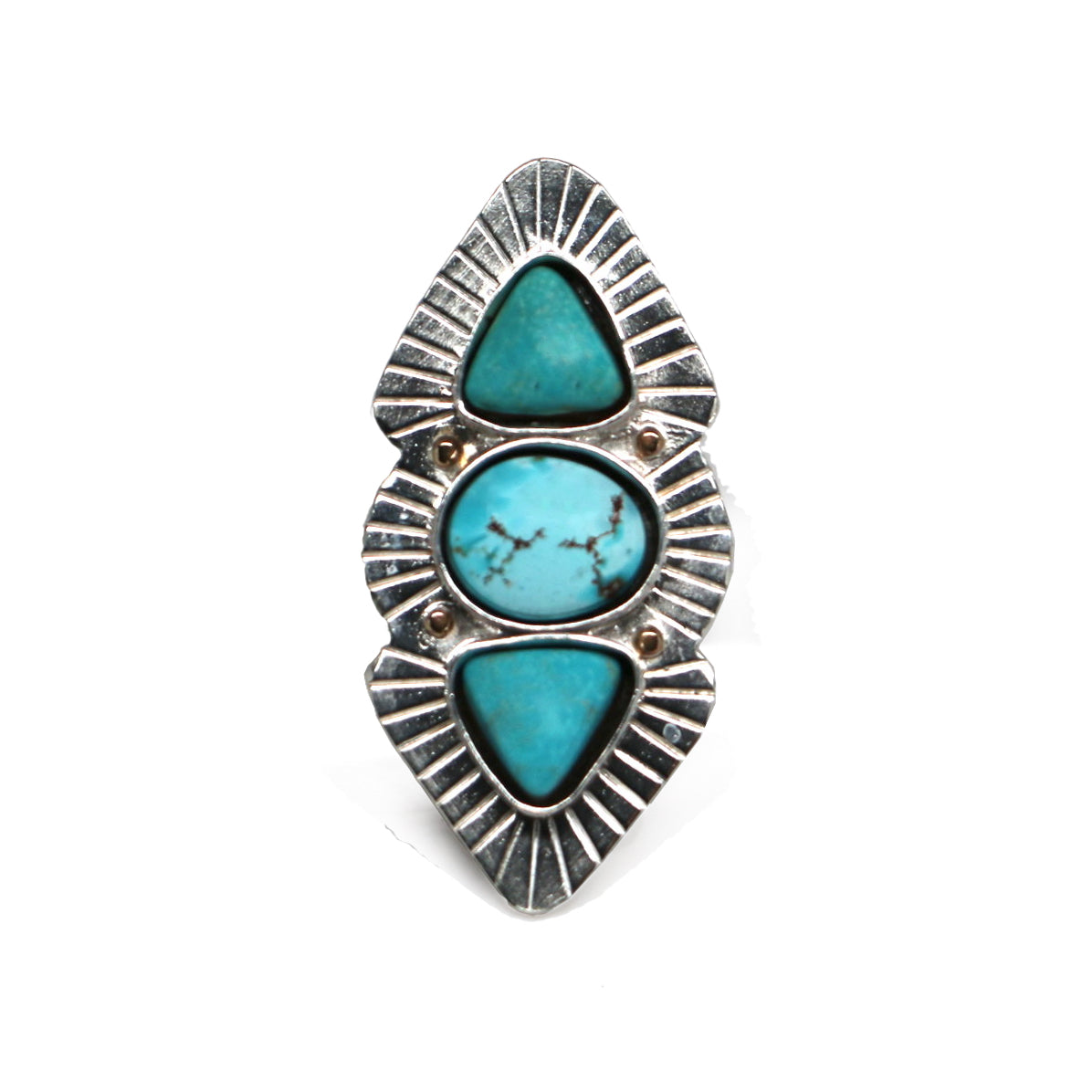 This triple stone ring features three complementary turquoise stones in Mexican Turquoise (triangles) and Golden Hills Turquoise (center stone). The stones are set in fine silver with a hand-stamped sterling silver backplate and argentium silver granulation (ball) details.