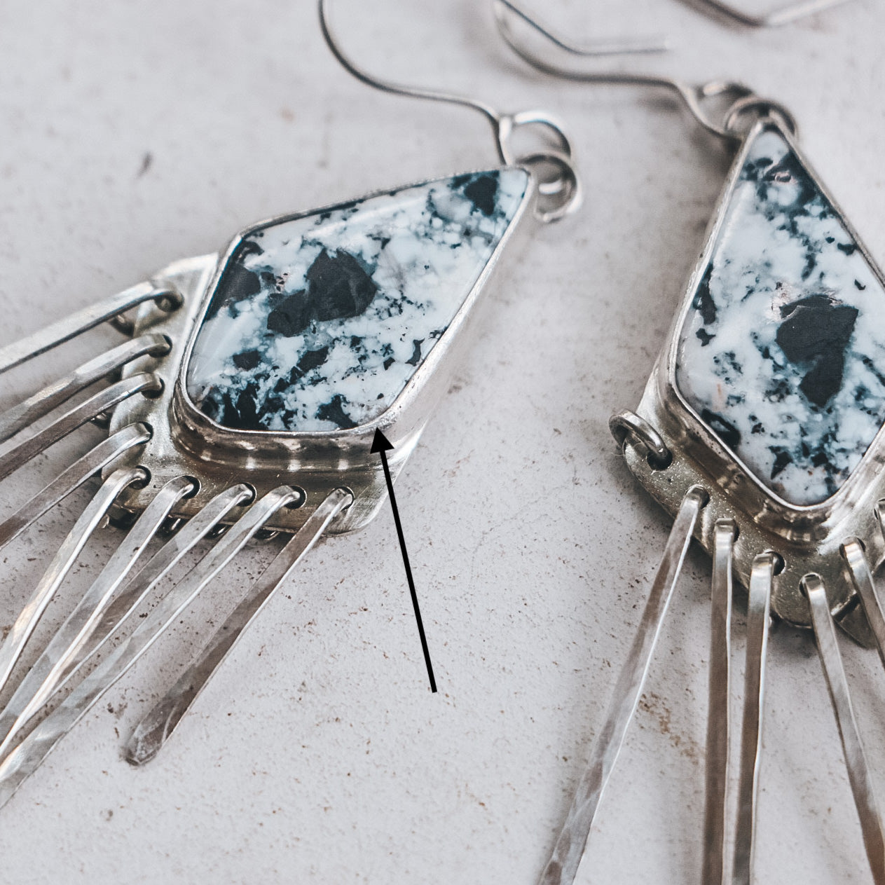 White Buffalo Turquoise, mined in Nevada, is a mix of white and black hues. These lightweight earrings measure 3.75" in length, and are set in sterling silver and fine silver.