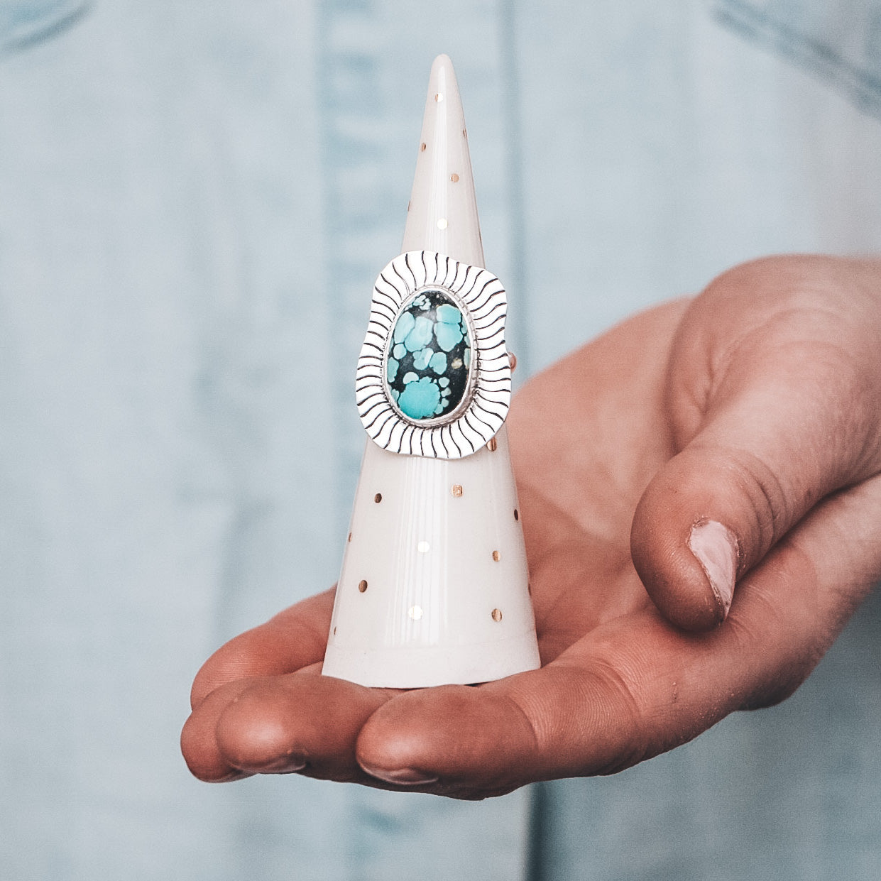 This porcelain ring cone was designed via collaboration with mod crmx, and was made special for Mineral + Mine. Each cone features 22k gold leaf detail in a unique pattern or quote. The detailed gold painting is done by hand by Kate, the one-woman-show behind Mineral + Mine.